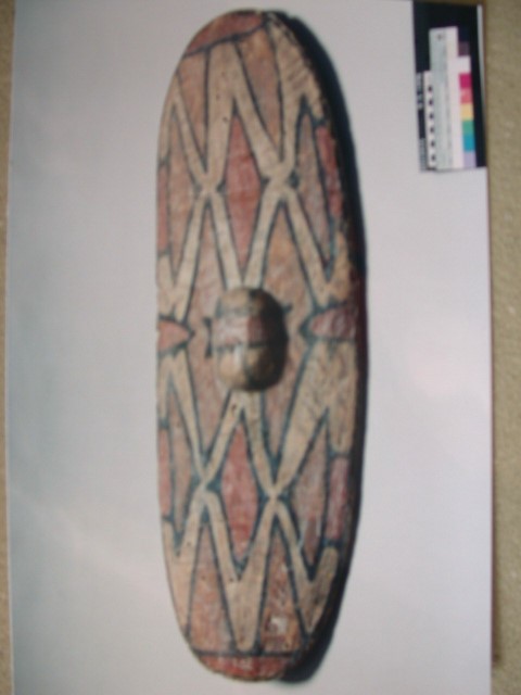 Red, black and white natural pigments with red ochre on back of shield.