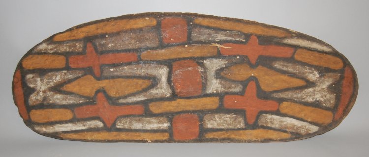 Description: Curved shield of wood, with a central raised boss. The front is painted with a design in faded white, red and yellow pigments outlined in black. The reverse is coloured red and has a loop handle cut from the solid. Donated by collector’s sister, Florence Walker – see the doc 907.