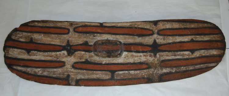 Painted shield made of wood, with a handle cut from the solid. Donated by collector’s sister, Florence Walker – see the doc 907.