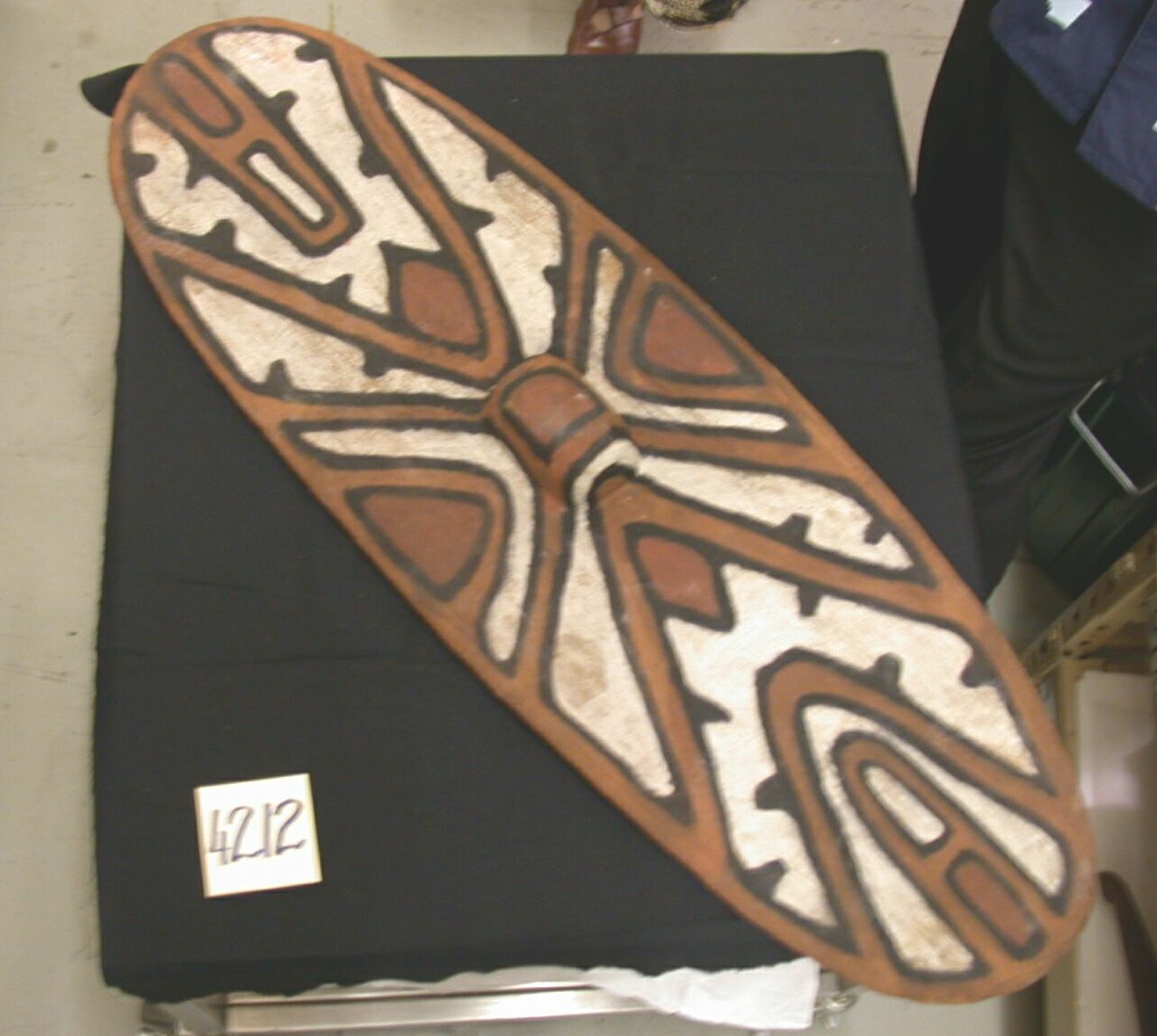 Carved wood with natural pigments. Shield, Cairns type. Small black triangles (scorpion stinger) in design suggest that this was made by a Yidinji man.